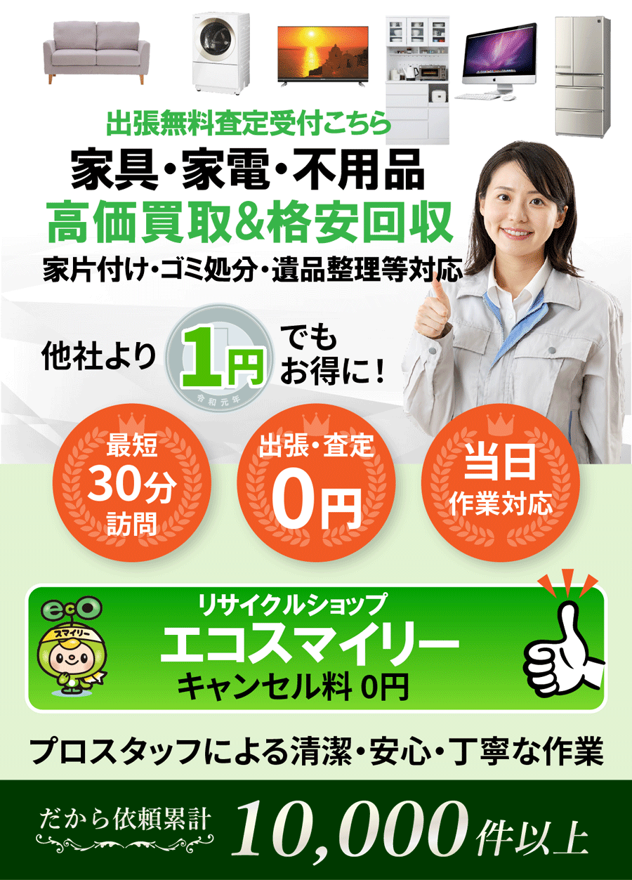 神奈川 粗大ゴミなんでも買取査定はエコスマイリーにお任せ|捨てる前に高価買取査定! 神奈川県内で粗大ゴミの処分にお困りではありませんか?「処分に費用がかかる」「まだ使えるのに捨てるのはもったいない」と感じている方に最適な