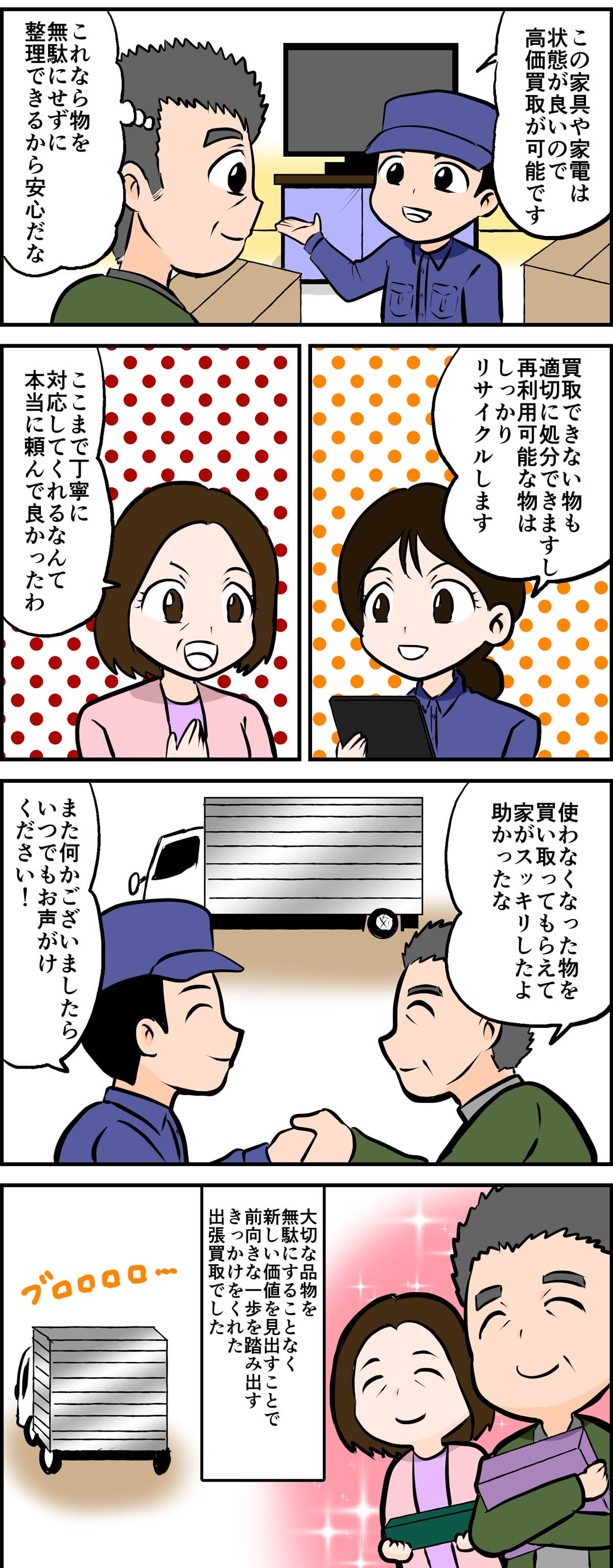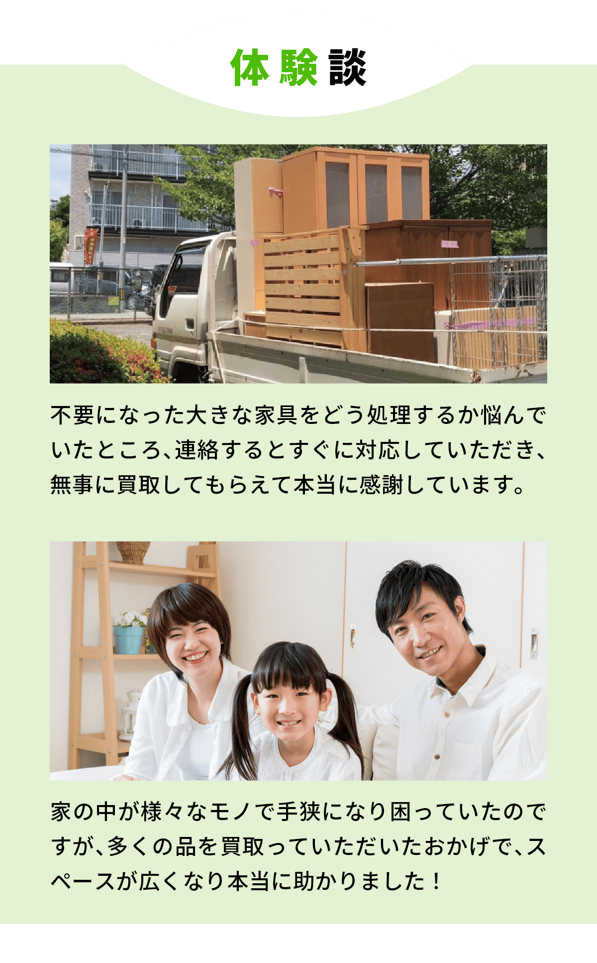 「アルフレックスのソファを買い替えるために、エコスマイリーの出張買取を利用しました。スタッフの対応がとても丁寧で、査定も素早く安心して任せることができました。出張査定は自宅でできるので、忙しい人にもおすすめです。また利用したいと思います!」