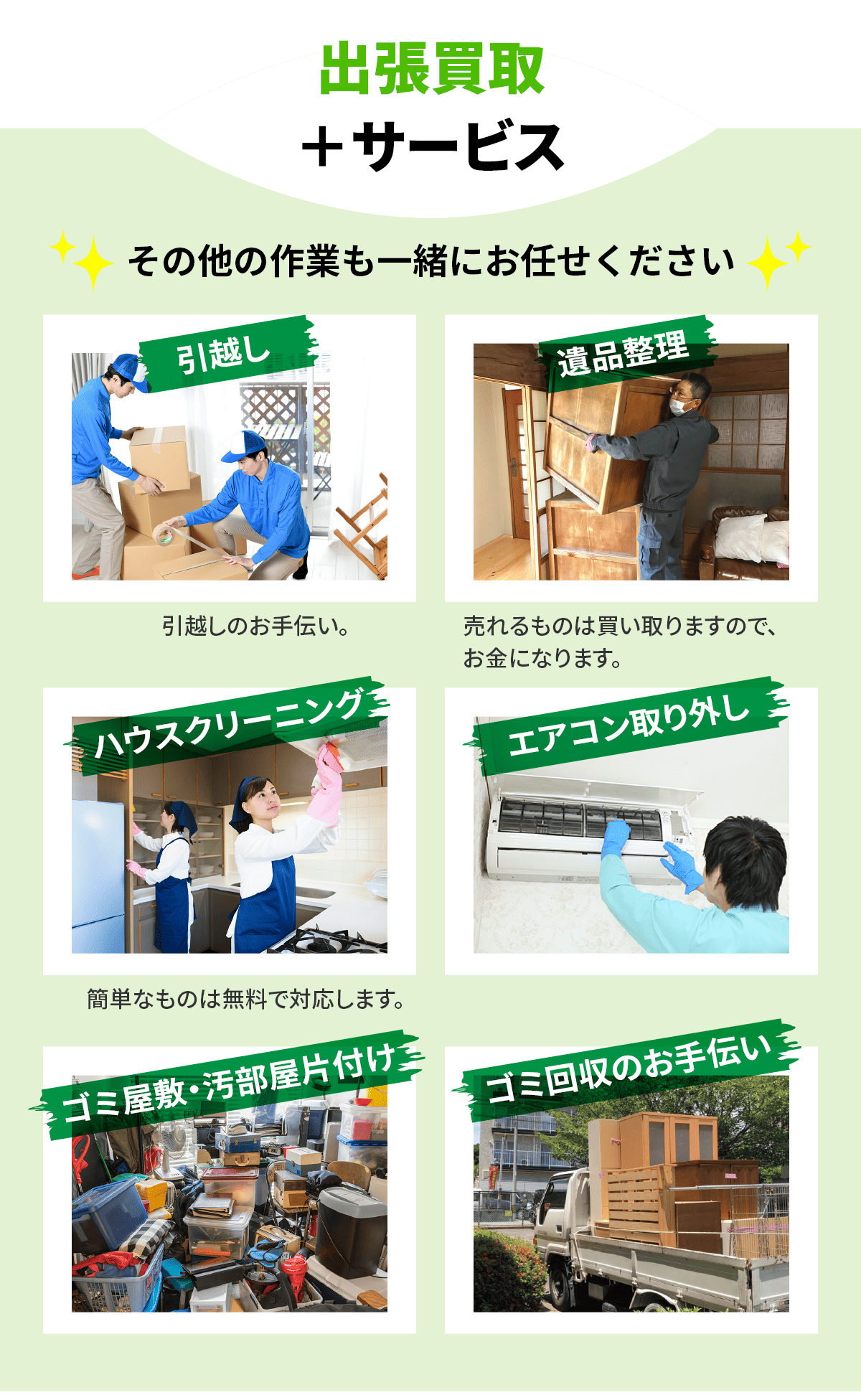– 無料査定や出張買取を提供しているか: 出張査定を無料で行ってくれる業者を選ぶことで、コストを抑えながら高額買取を狙えます。