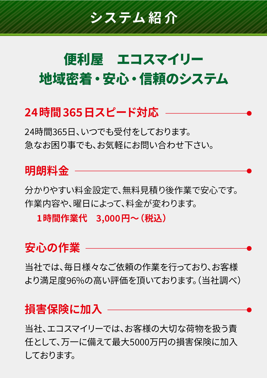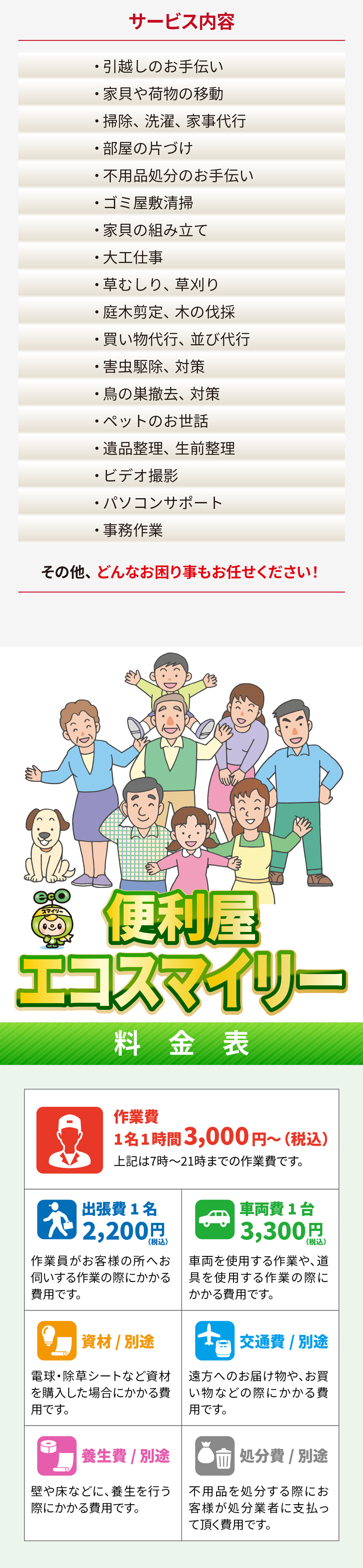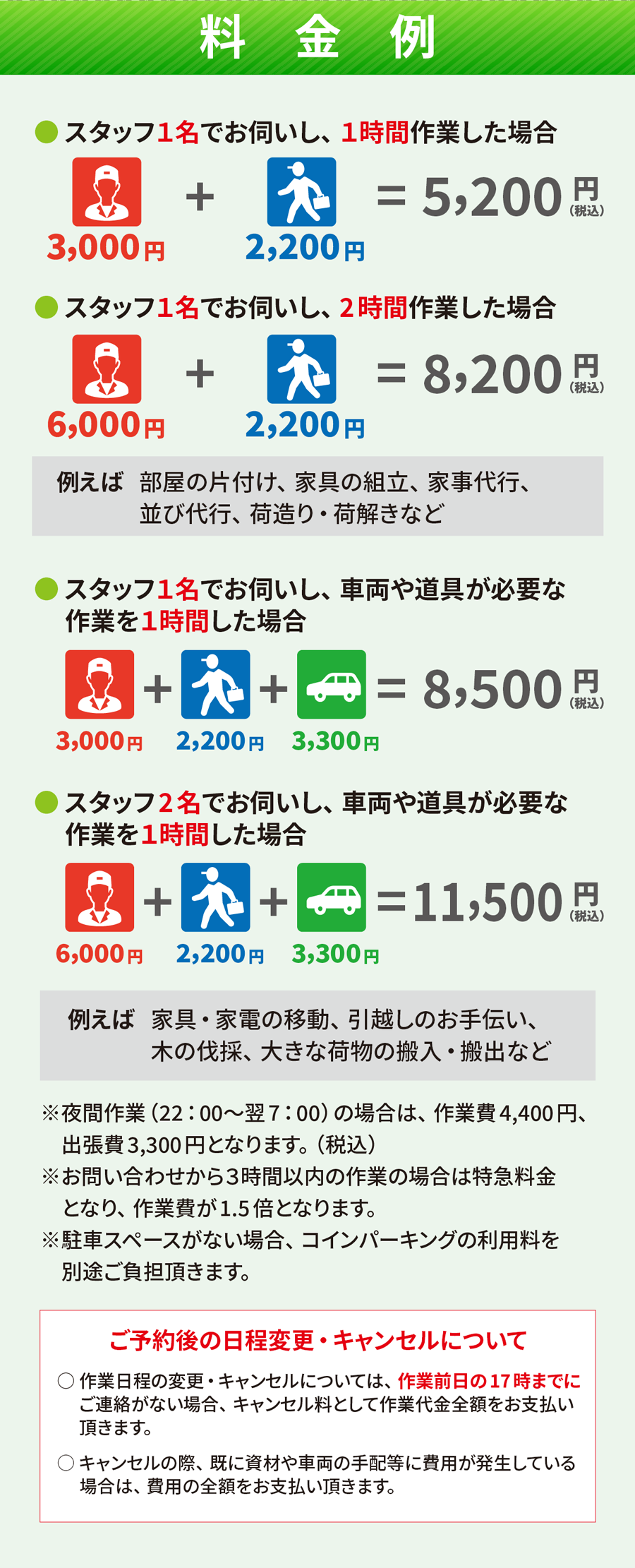 A. 家具の組立・引越し手伝い・草刈り・片付け・電球交換など幅広く対応可能です。まずはご相談ください。