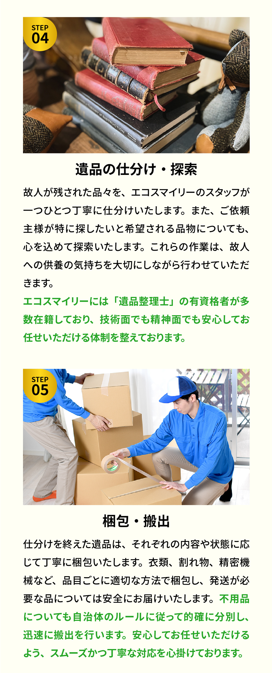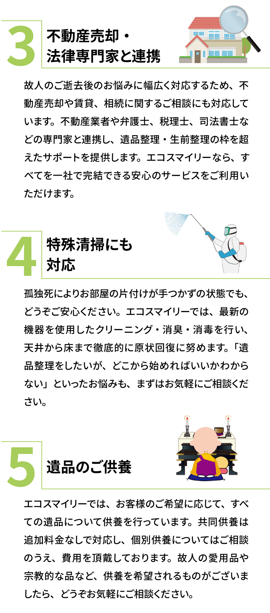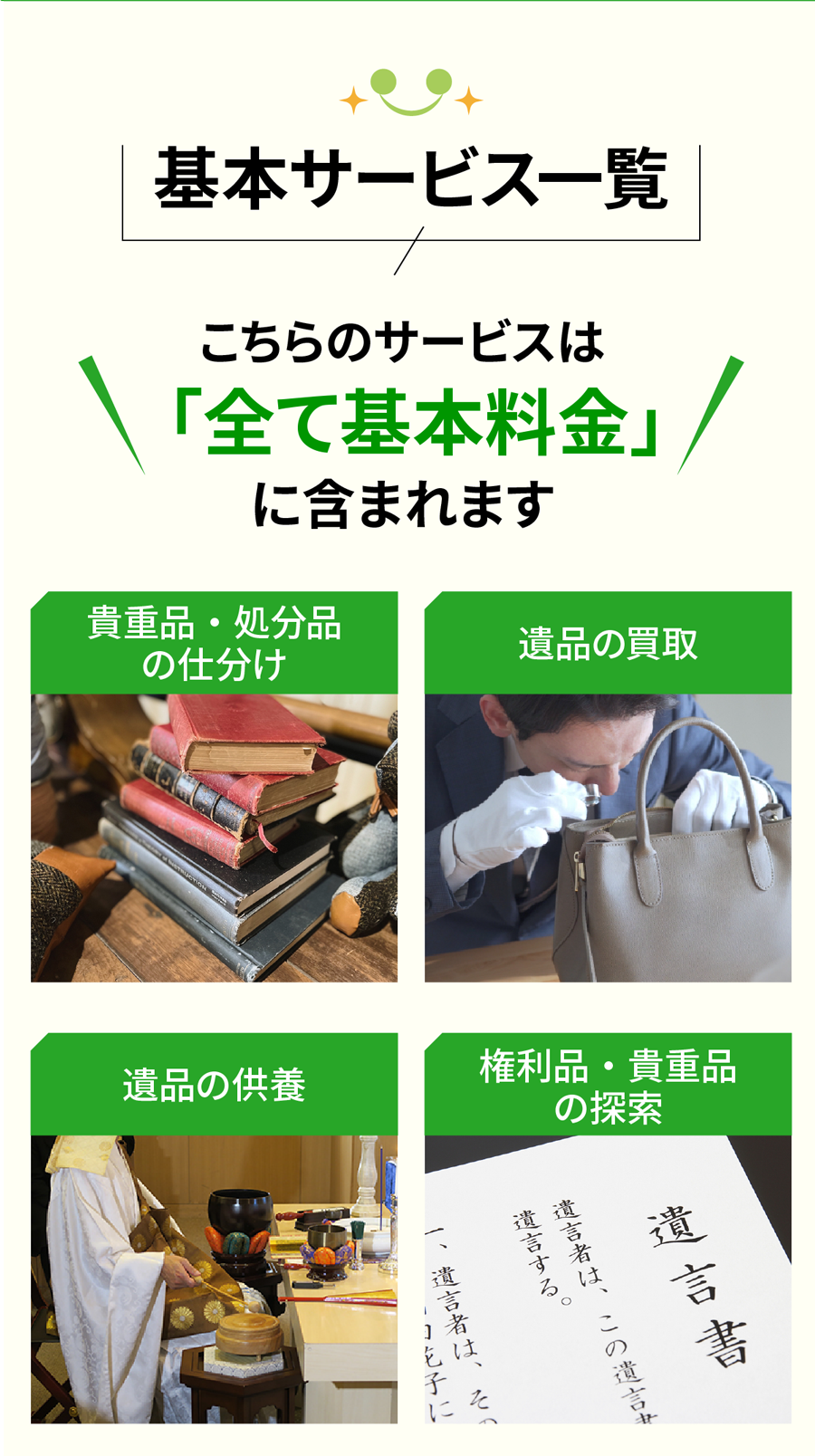 エコスマイリーでは、遺品整理・生前整理に関わる作業をすべて一括対応しています。遺品の仕分けや梱包はもちろん、合同供養・買取・貴重品探索・特殊清掃・クリーニングまで幅広く対応可能です。
