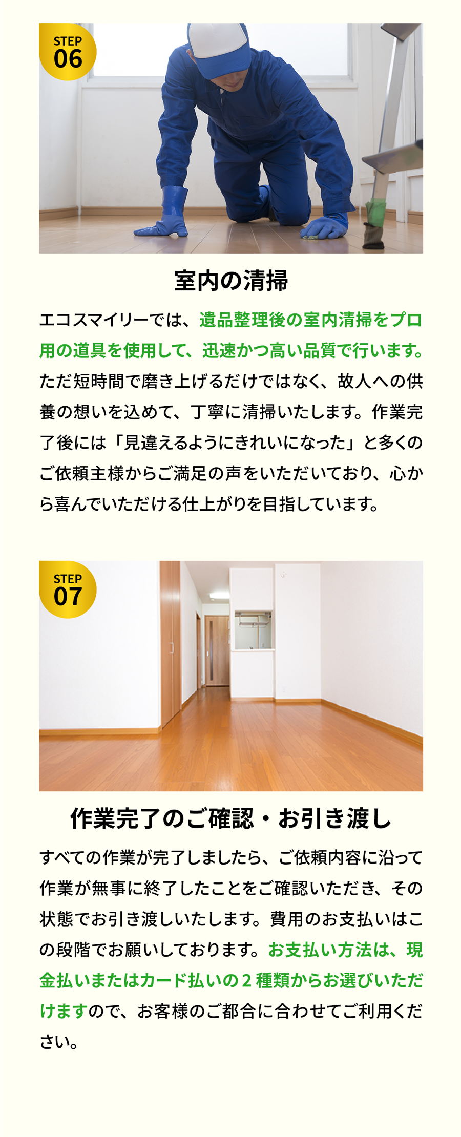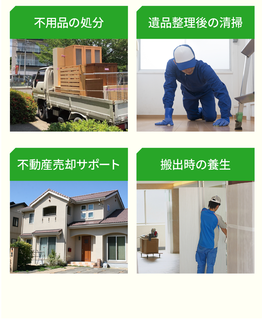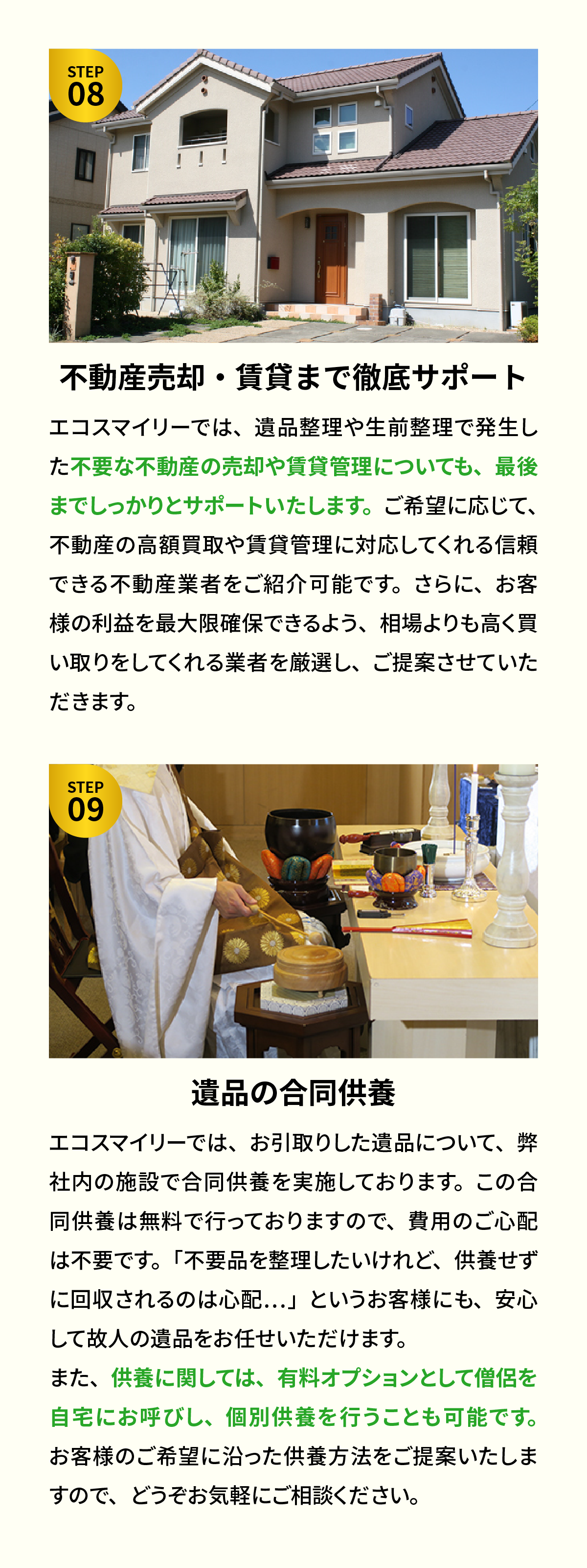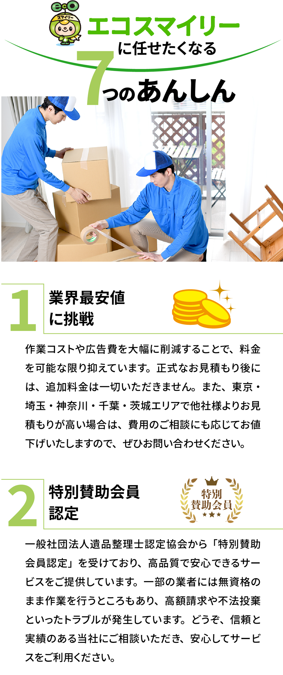 エコスマイリーでは、遺品整理・生前整理に関わる作業をすべて一括対応しています。遺品の仕分けや梱包はもちろん、合同供養・買取・貴重品探索・特殊清掃・クリーニングまで幅広く対応可能です。