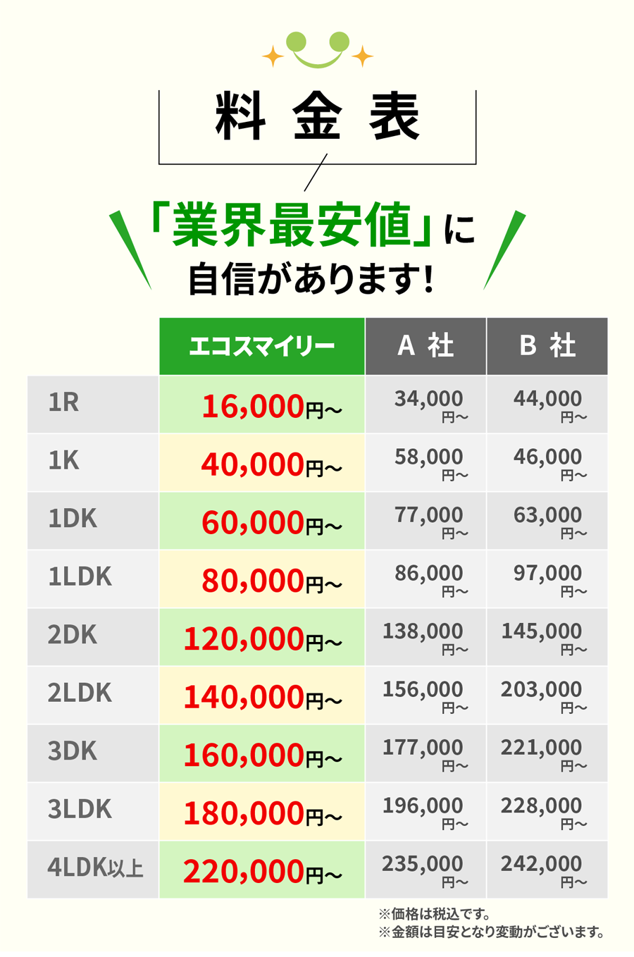 A. お部屋の広さ・物量・搬出条件などで決まります。事前見積り後の追加請求は原則ありませんのでご安心ください。