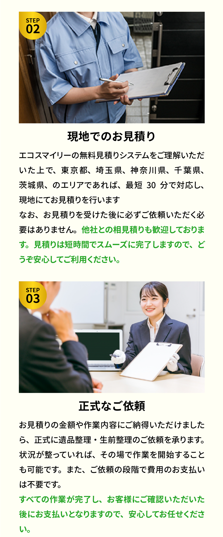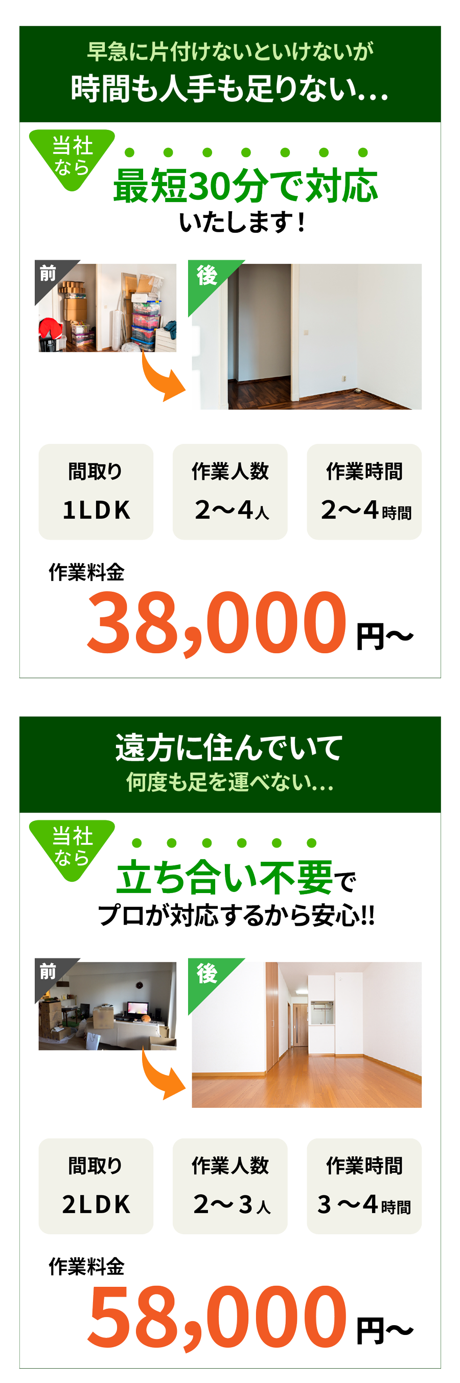 最短30分で訪問可能なスピード対応に加え、出張見積0円・追加料金なしの明朗会計で安心してご利用いただけます。関東エリアを中心に幅広く対応し、急ぎのご依頼や大量の整理にも柔軟に対応可能です。