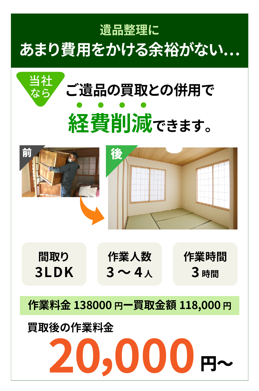 A. 家電・家具・ブランド品・貴金属など再販可能な物は買取し、整理費用から差し引き可能です。