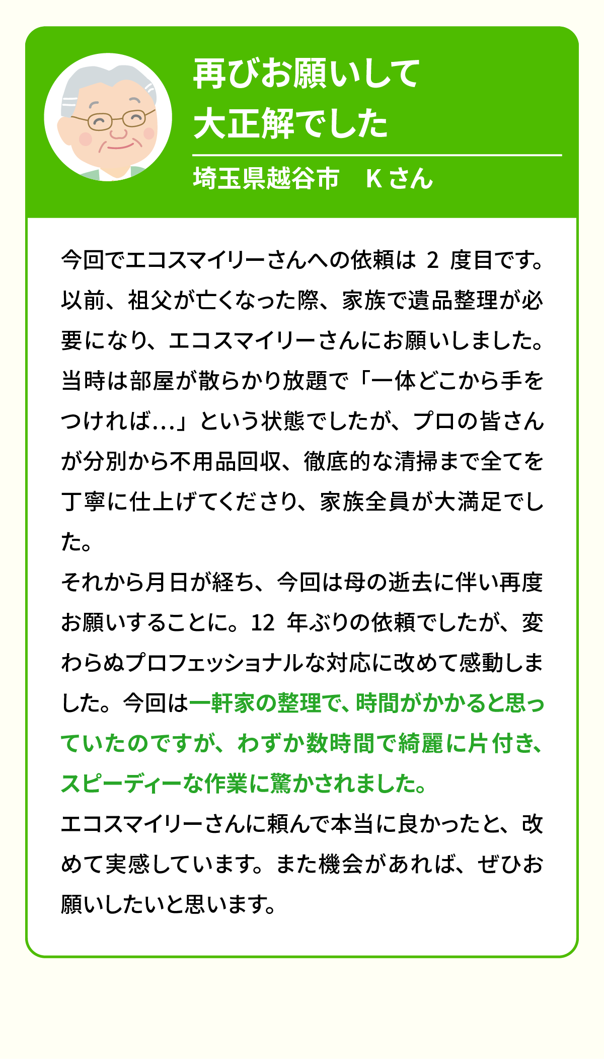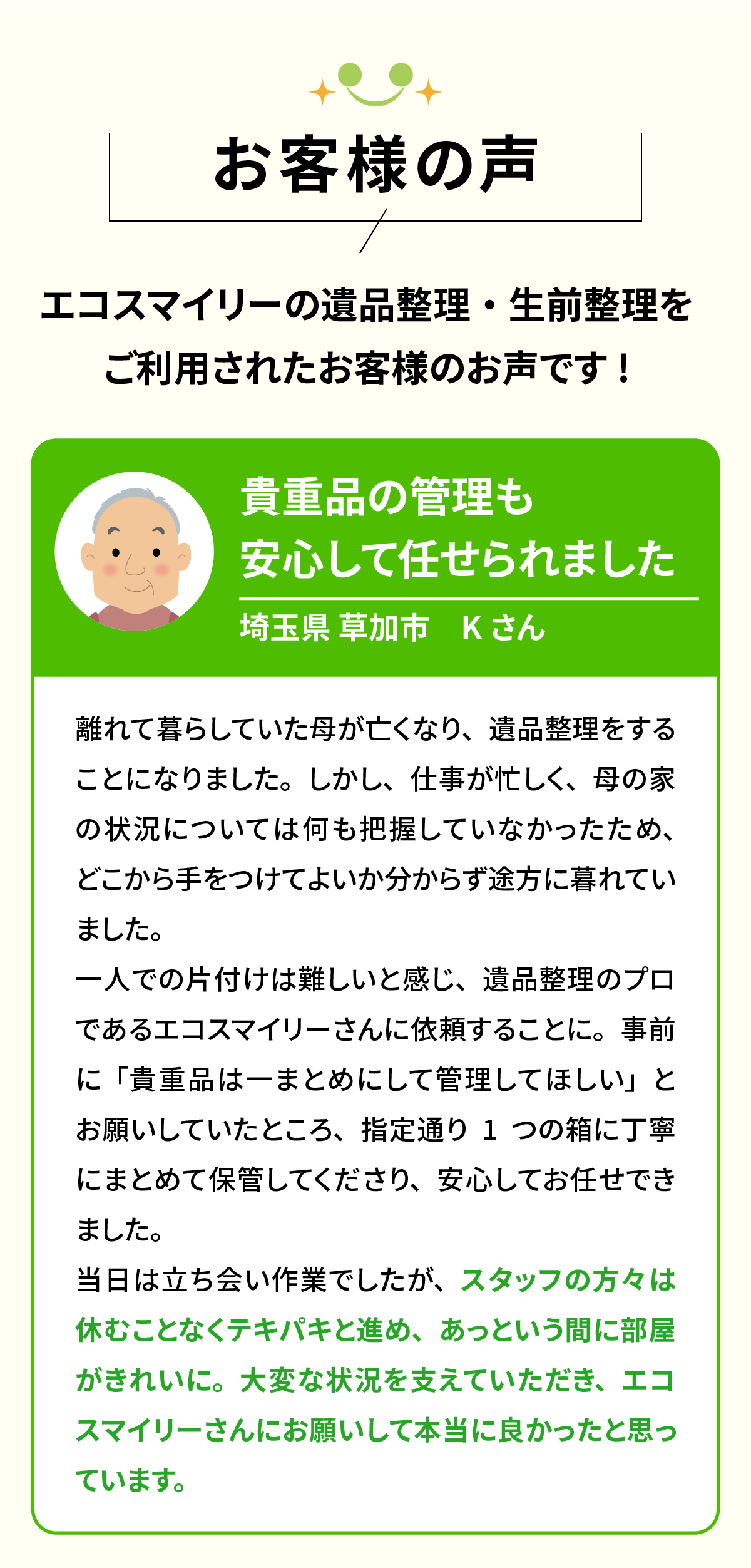 エコスマイリーでは、こうしたお悩みに寄り添いながら、仕分け・探索・回収まで一括で対応。大切なものを見逃さず、安心して任せられる遺品整理をご提供しています。