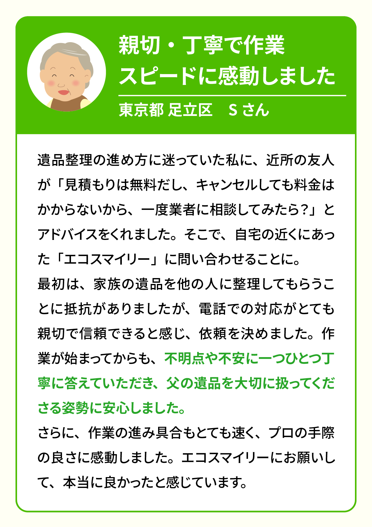 エコスマイリーでは、遺品整理・生前整理を経験豊富なスタッフが丁寧に対応いたします。ご遺族様の気持ちに寄り添いながら、仕分け・搬出・回収まで一括対応。