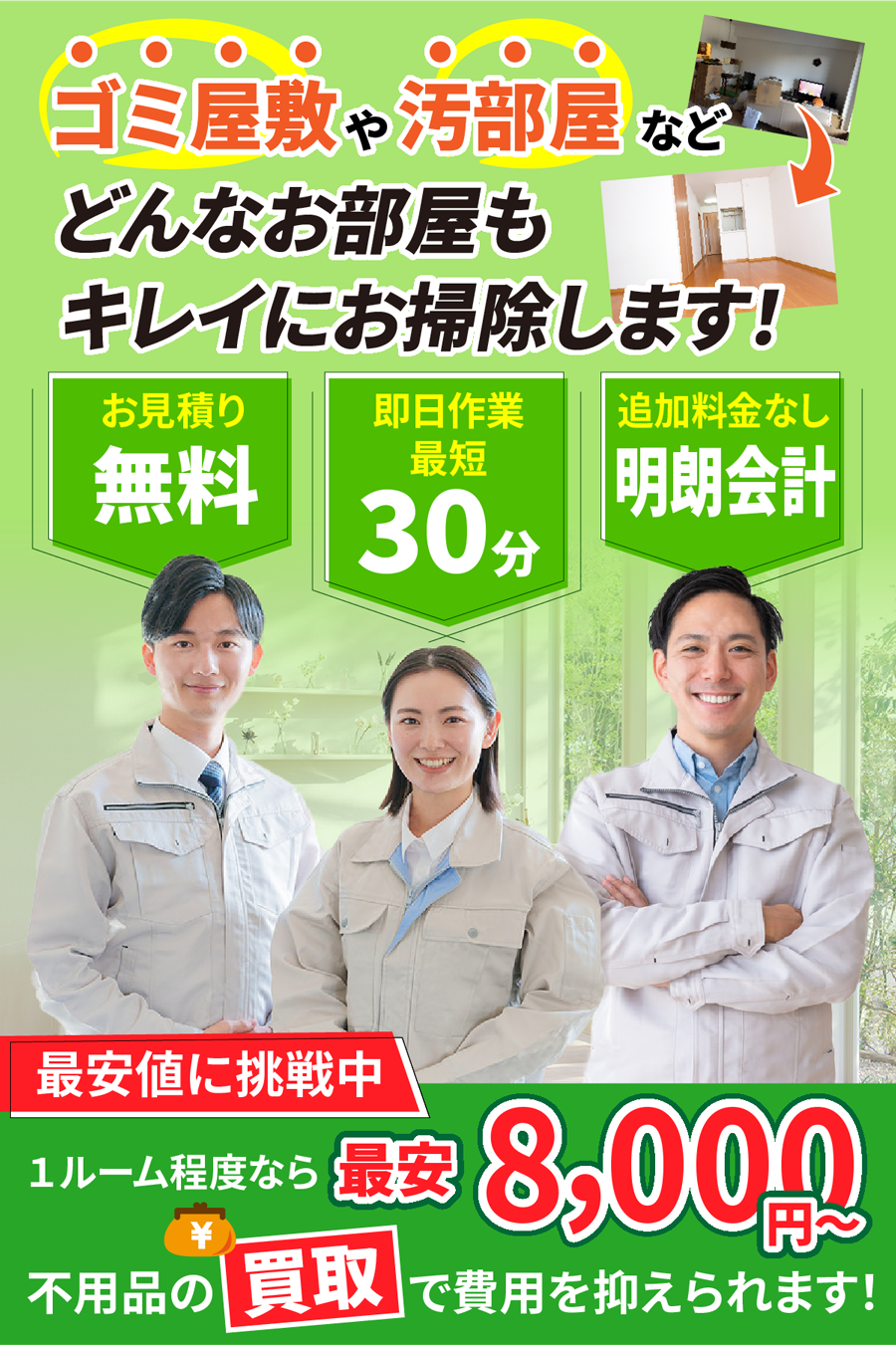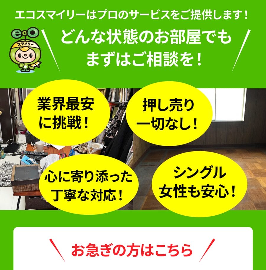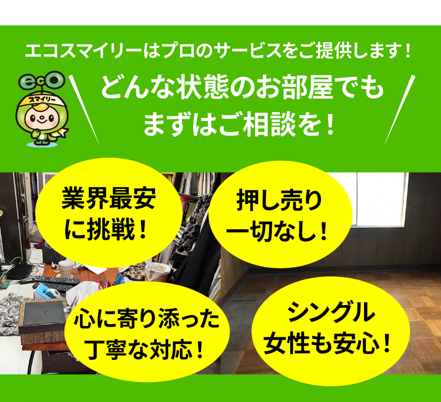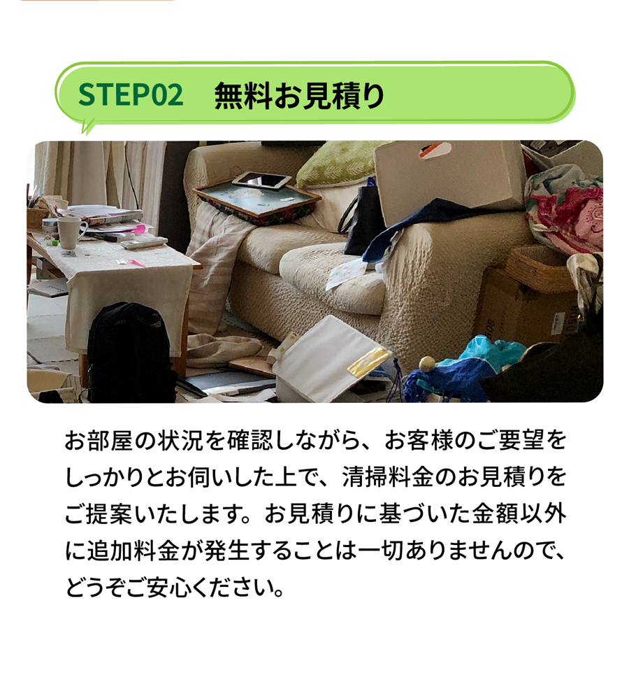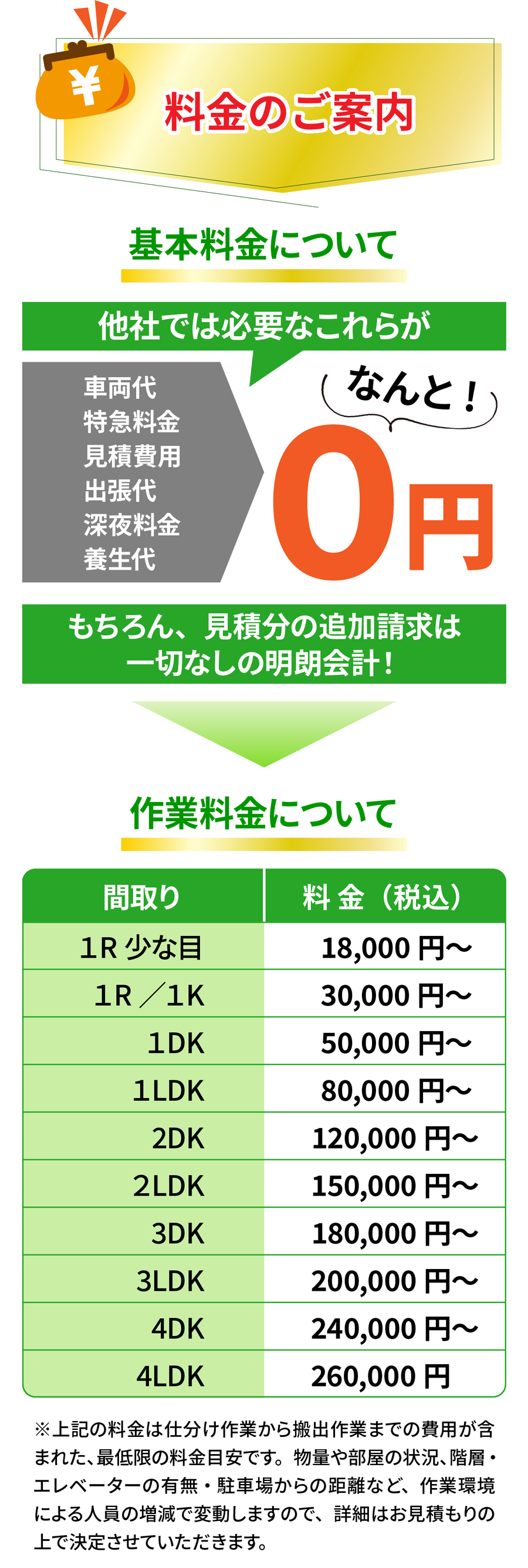 A. お部屋の広さ・物量・搬出条件で決まります。事前見積り後の追加請求はありませんのでご安心ください。