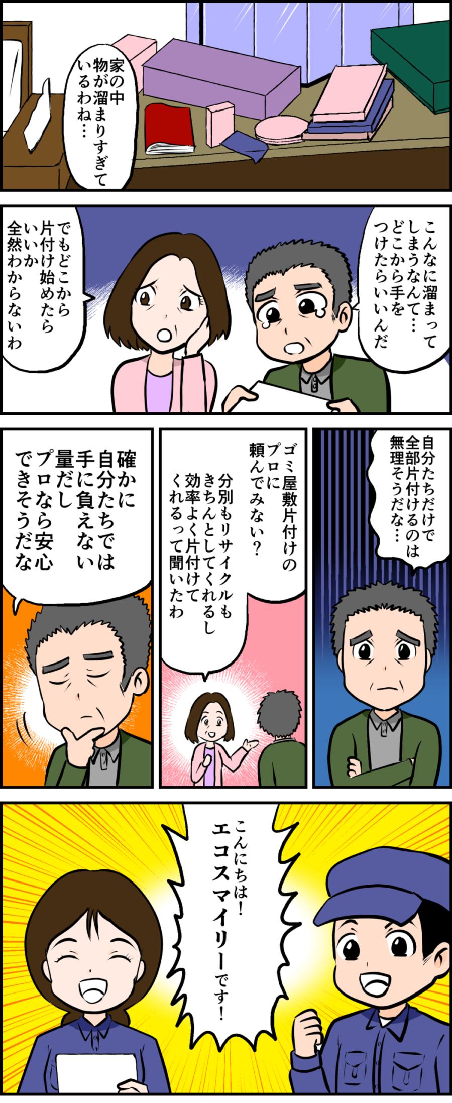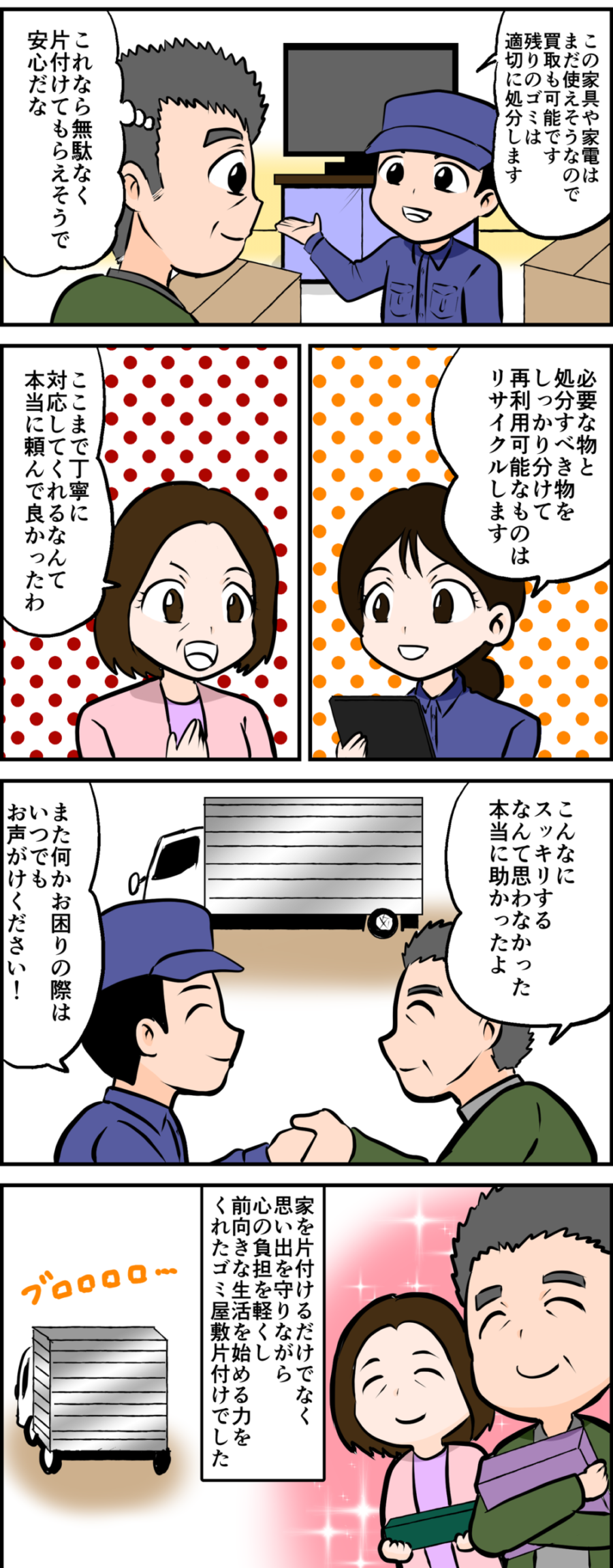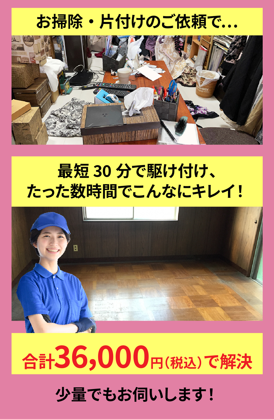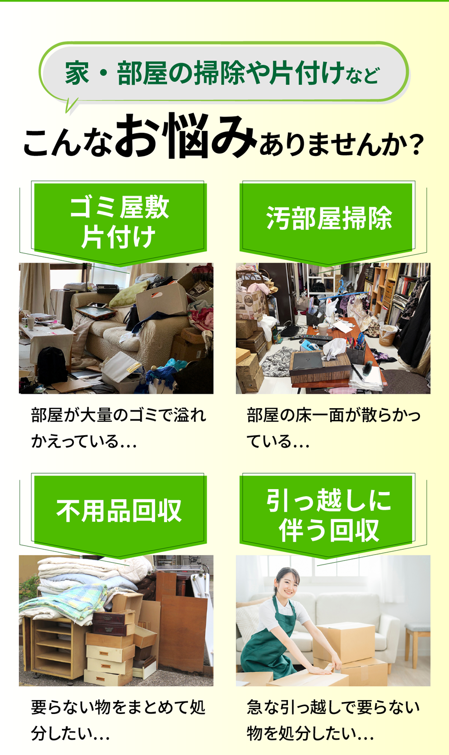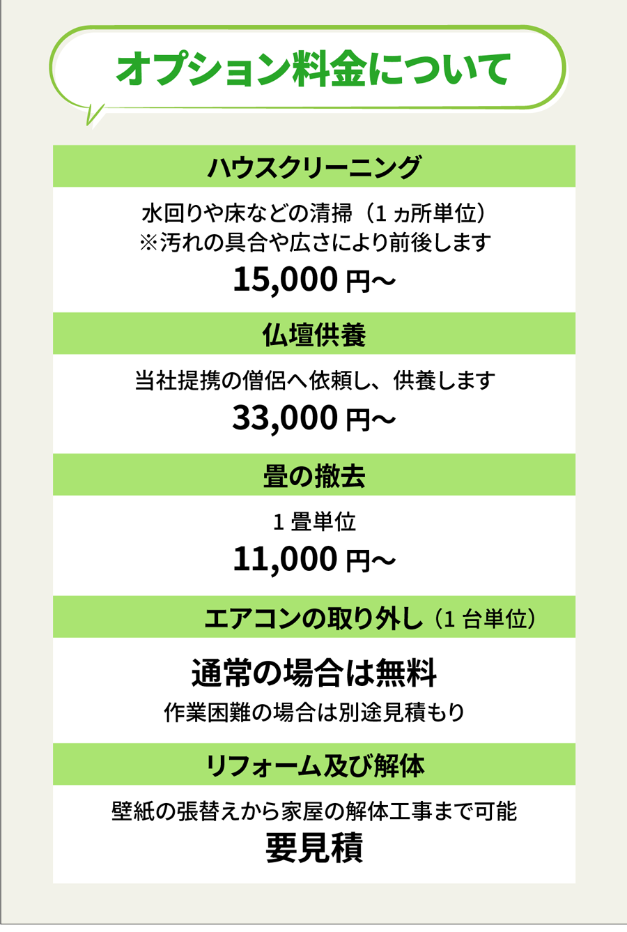 A. お部屋の広さ・物量・搬出条件で決まります。事前見積り後の追加請求はありませんのでご安心ください。