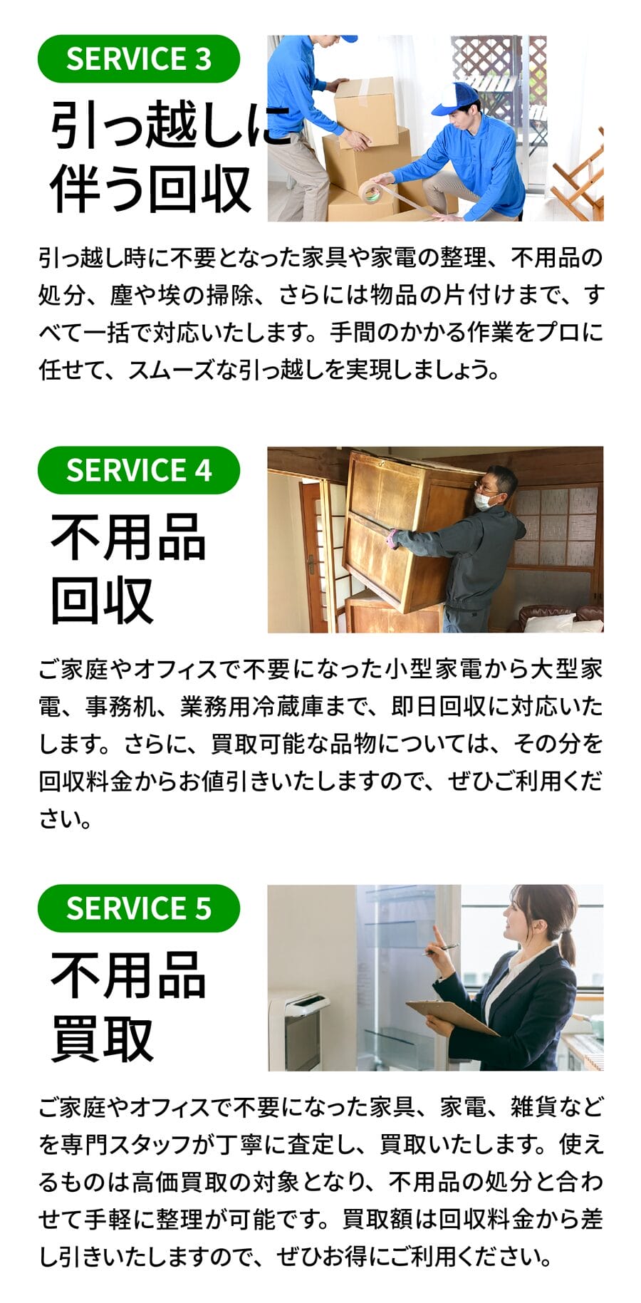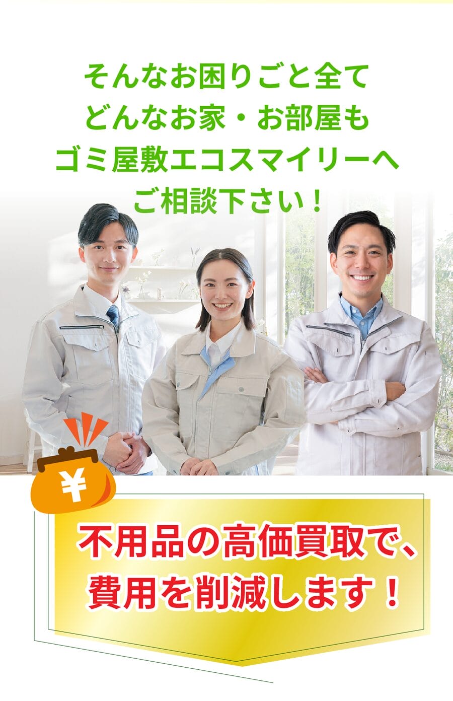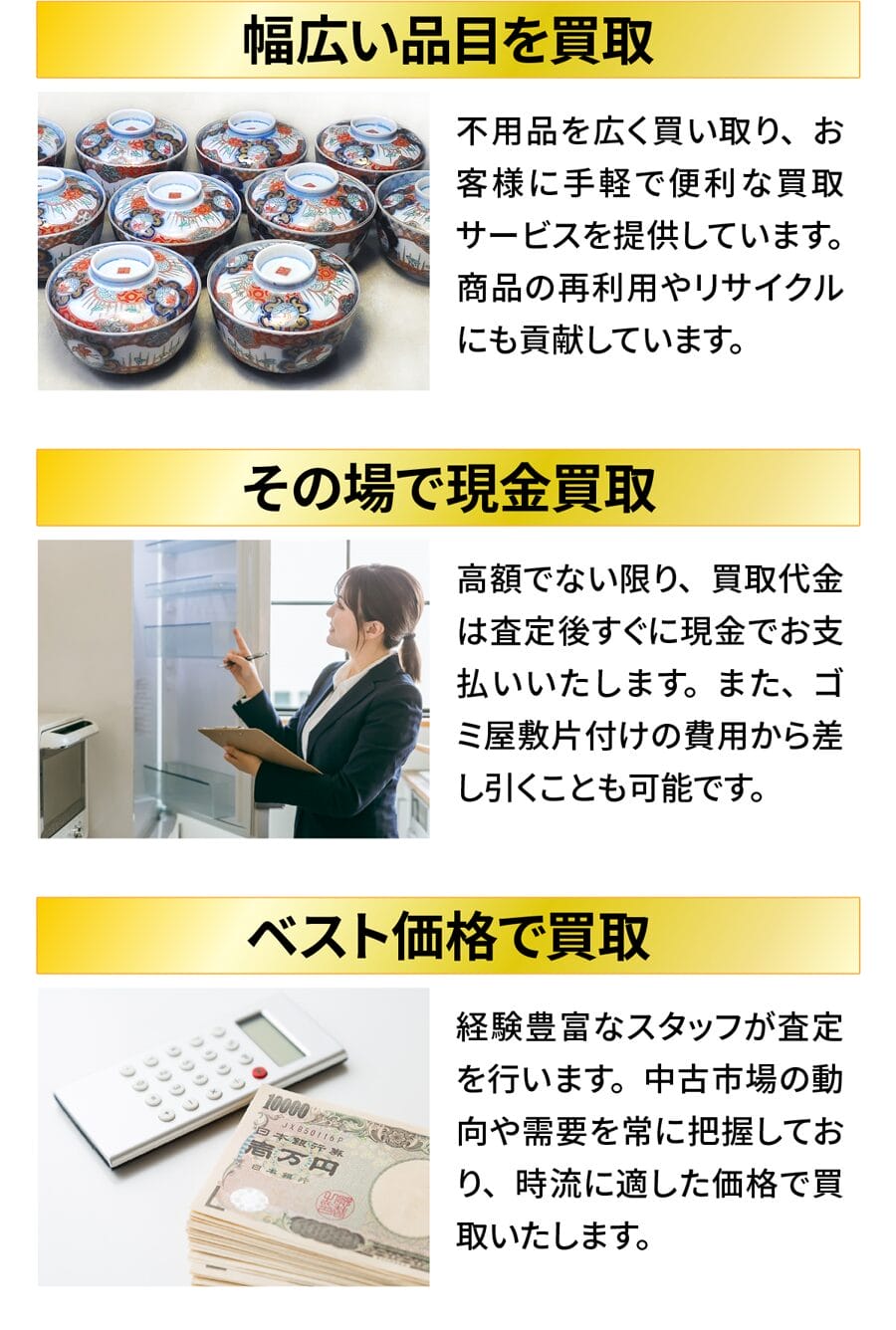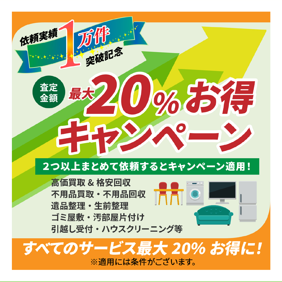 A. 家電・ブランド品・家具など再販可能な物は買取いたします。買取分を差し引き費用圧縮が可能です。